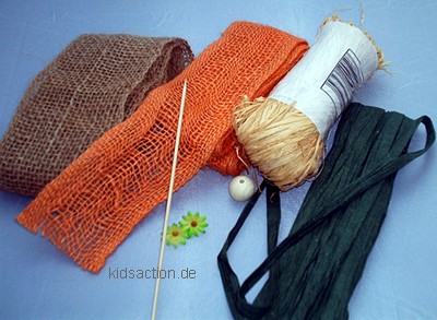 - Dann ein Stück orangfarbenes Sisalband abschneiden und über den Spieß und die Arme legen