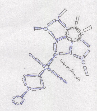 | Grundsätzliches Schneeflocken werden in der Regel mit mehreren Drahtstücken gearbeitet. Dazu in den ersten Kreis weitere Drahtstücke einhängen. Alle Draht- enden müssen am Schluß vernäht werden indem man sie wieder ein Stück zurück arbeitet. So wird's gemacht: Am Besten druckt ihr die Vorlage aus. Begonnen wird auch dieses Stück mit einem Kreis aus 6 durchsichtigen Perlen. Zwischen den einzelnen PErlen noch 5 weitere Drahtstücke einfügen = 6 Doppeldrahtenden. Nun durch jeden der Doppeldrähte einen silbernen Stift fädeln, anschließend auf jeden Draht zwei Stifte fädeln. Wie im Bild je zwei Drähte wieder durch eine Perle und einen Stift laufen lassen. Jetzt wieder jeden Draht für sich: Perle Stift Perle auffädeln, dann eine weitere Perleals Randstück und wieder durch die anderen zurück. Wieder beide Dräht durch einen Stift. Drähte trennen je Stift Perle Stift auffädeln und kantig biegen, beide Drähte durch eine Perle und Stift fädeln. Am Schluß auf einen Draht 6 Perlen auf- fädeln und mit dem anderen Draht gegeleich durchfahren damit es einen Kreis gibt. Drähte vernähen. die anderen Dräht ebenso verarbeiten. |