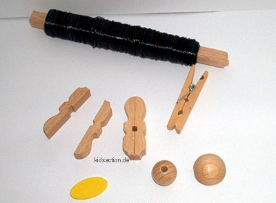 Trennt den spitzen Teil der Klammerhälften mit der Säge ab. Klebt dann 2 Klammerhälften mit der welligen Seite nach außen zusammen. Nun die kleine Holzkugel als Kopf mit der Grundfarbe anmalen und trocknen lassen. Teilt unterdessen die große Holzkugel. Setzt dafür einen Stechbeitel auf das Loch in Maserrichtung und schlagt kurz auf den Beitel. Ggf. die Spaltstellen etwas glatt schleifen. Leimt nun die Klammerhälften wie auf dem Foto zusammen.